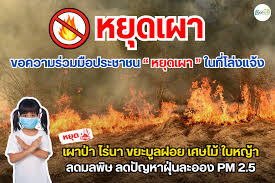 หยุดเผาในที่โล่ง เพื่อลดปัญหามลพิษจากไฟป่า หมอกควันและฝุ่นละอองขนาดเล็ก (PM2.5) ด้วยในช่วงหน้าแล้งของทุกปีระหว่างเดือนมกราคมถึงเดือนพฤษภาคม พื้นที่เกือบทุกภาคของประเทศไทยมักประสบกับปัญหาไฟป่า ซึ่งเป็นสาเหตุสำคัญที่ก่อให้เกิดปัญหาวิกฤตมลพิษหมอกควัน และฝุ่นละอองขนาดเล็ก (PM 2.5) ส่งผลกระพบต่อการดำรงชีวิต เศรษฐกิจ สังคม และสุขภาพอนามัยของประชาชน คุณภาพสิ่งแวดล้อม และทัศนวิสัยในการคมนาคมทั้งทางบกและทางอากาศ นอกจากนี้ สาเหตุสำคัญประการหนึ่งที่ทำให้หมอกควันและค่าฝุ่นละอองมีความเข้มข้นมากขึ้นยังเกิดจากการประกอบกิจกรรมของเกษตรกรและประชาชนในพื้นที่อาทิการเผาอ้อย ฟางข้าว ซังข้าวโพดหญ้า ขยะ และวัชพืชในที่ทำกินของเกษตรกร เป็นต้น